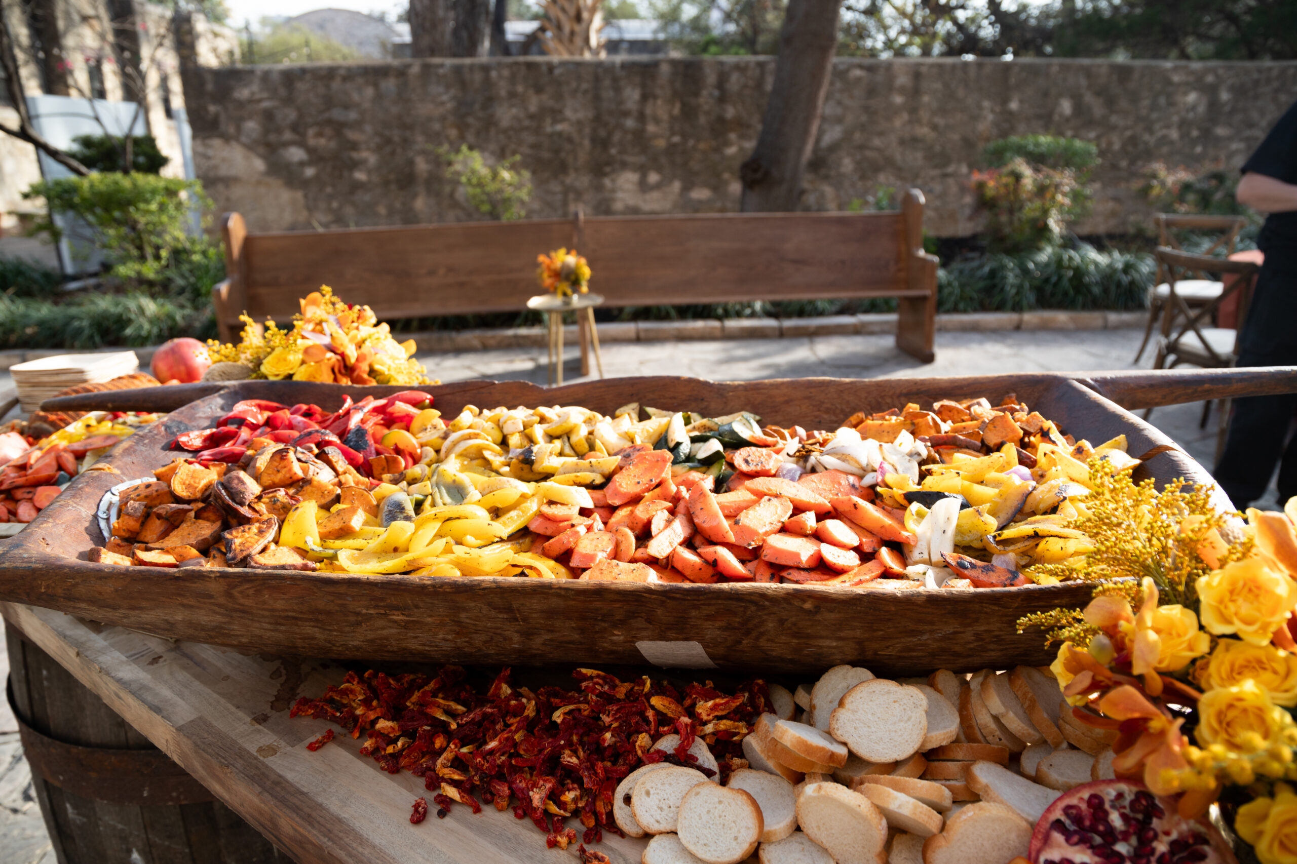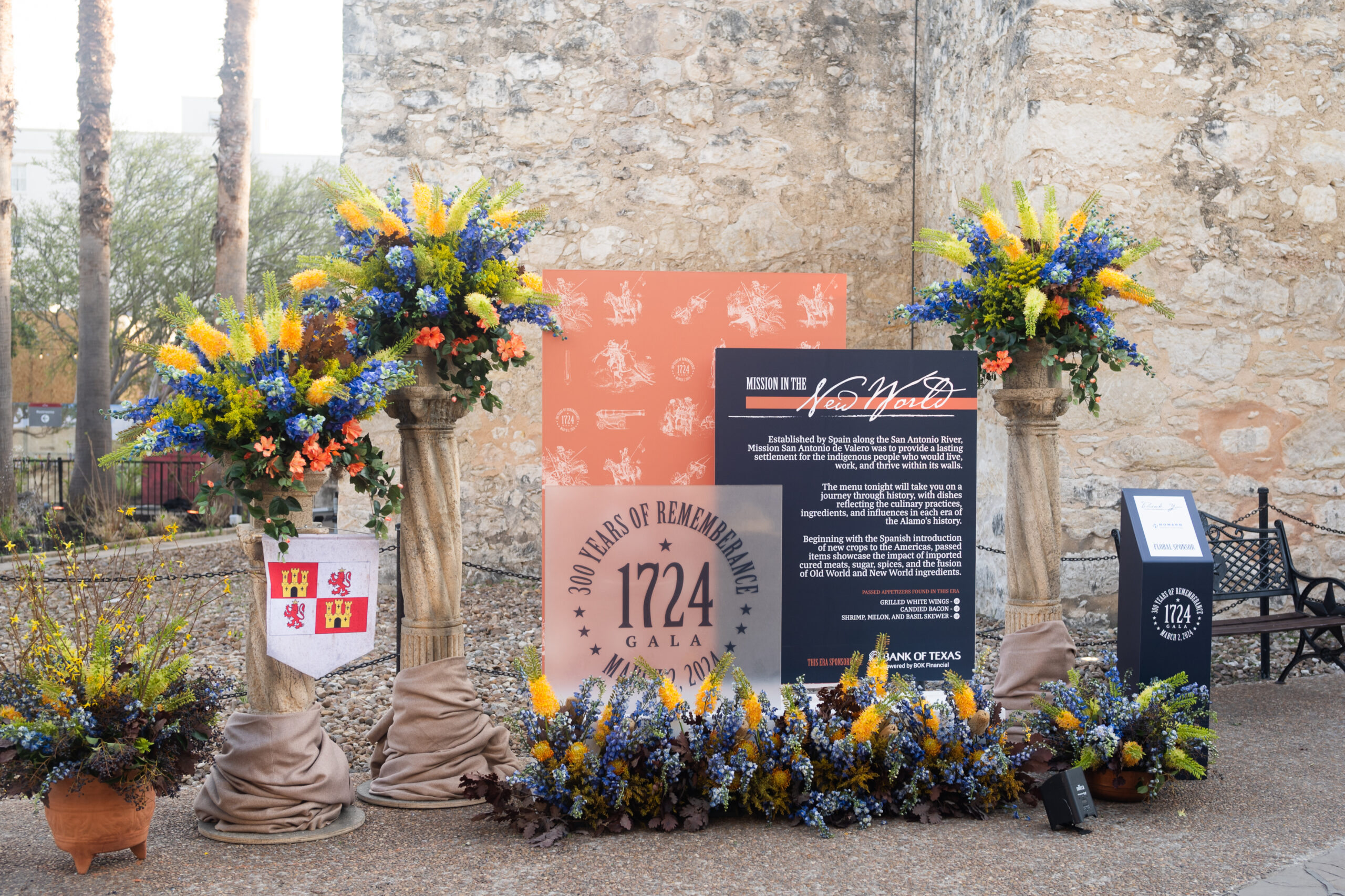 Beginning at the inception of the Spanish mission during the “Mission in the New World” cocktail hour, guests wandered through earthy decor and sampled appetizers that paid homage to the mingling of Spanish and Native American cuisine. Our team also incorporated church pews into the furniture to allude to the heavy influence of the Spanish Christian missionaries on the Alamo.