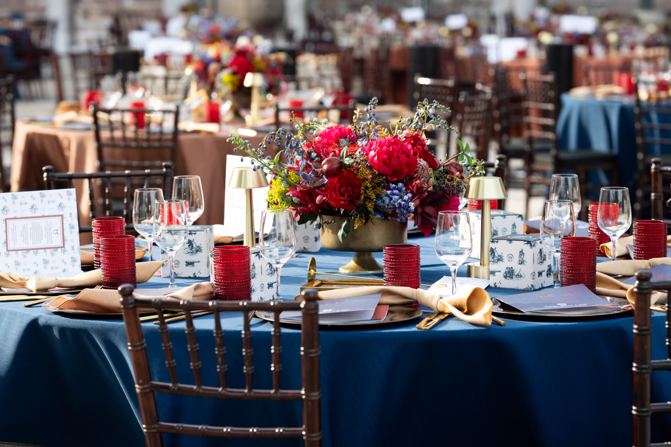 From there, guests made their way to the next era; a dinner and auction titled “Land, Opportunity, Conflict”. This next segment began with a musket firing; a symbol of the rebellion and battles that ensued during the rise of Mexico’s political leader, Santa Anna. Blood reds were incorporated in floral and tablescape elements to recognize the blood shed during this era.
